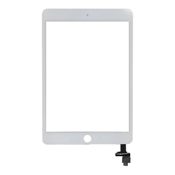 Kompletny panel dotykowy (digitizer) do Apple iPad Mini 3 Biały (White), zawierający fabrycznie zainstalowane: przycisk HOME, taśmę samoprzylepną, ramkę aparatu przedniego, taśmy do podpięcia do urządzenia oraz folie ochronne z przodu i tyłu.